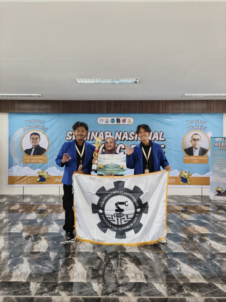 Surabaya — Mahasiswa Program Studi Teknologi Rekayasa Otomasi, angkatan pertama Politeknik Negeri Madiun (PNM), berhasil menorehkan prestasi perdana dengan meraih Juara Harapan I pada ajang INERGYC (International Energy and Robotics Youth Competition) 2025 yang diselenggarakan di Politeknik Perkapalan Negeri Surabaya (PPNS).
